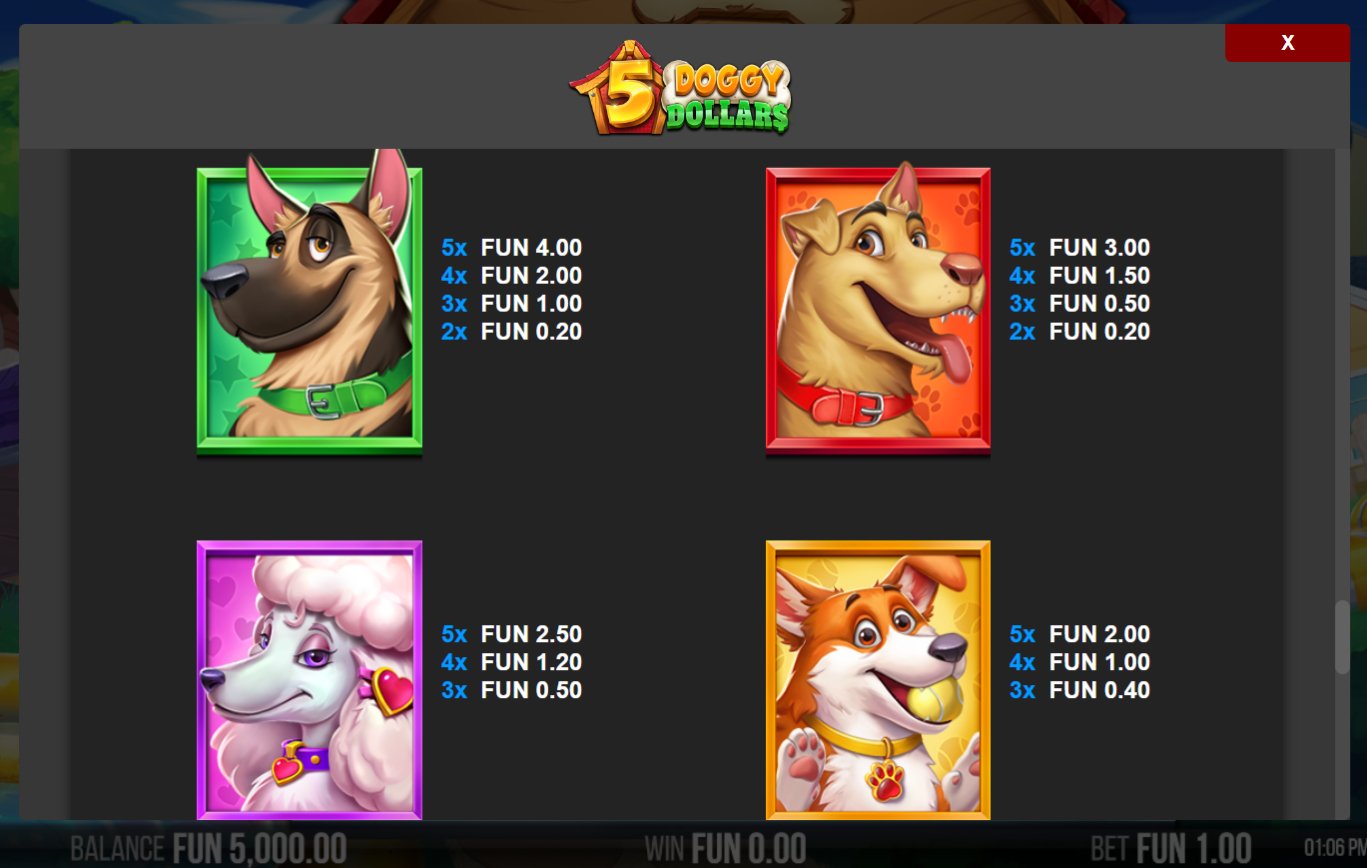 5 Doggy Dollars har en kreativ udbetellerngstabel fuld af nuttede og søde symboler med fem forskellige hunderacer, lækre hundegodbidder til jeres små venner og klassiske kortsymboler markeret med søde hundepoteaftryk.