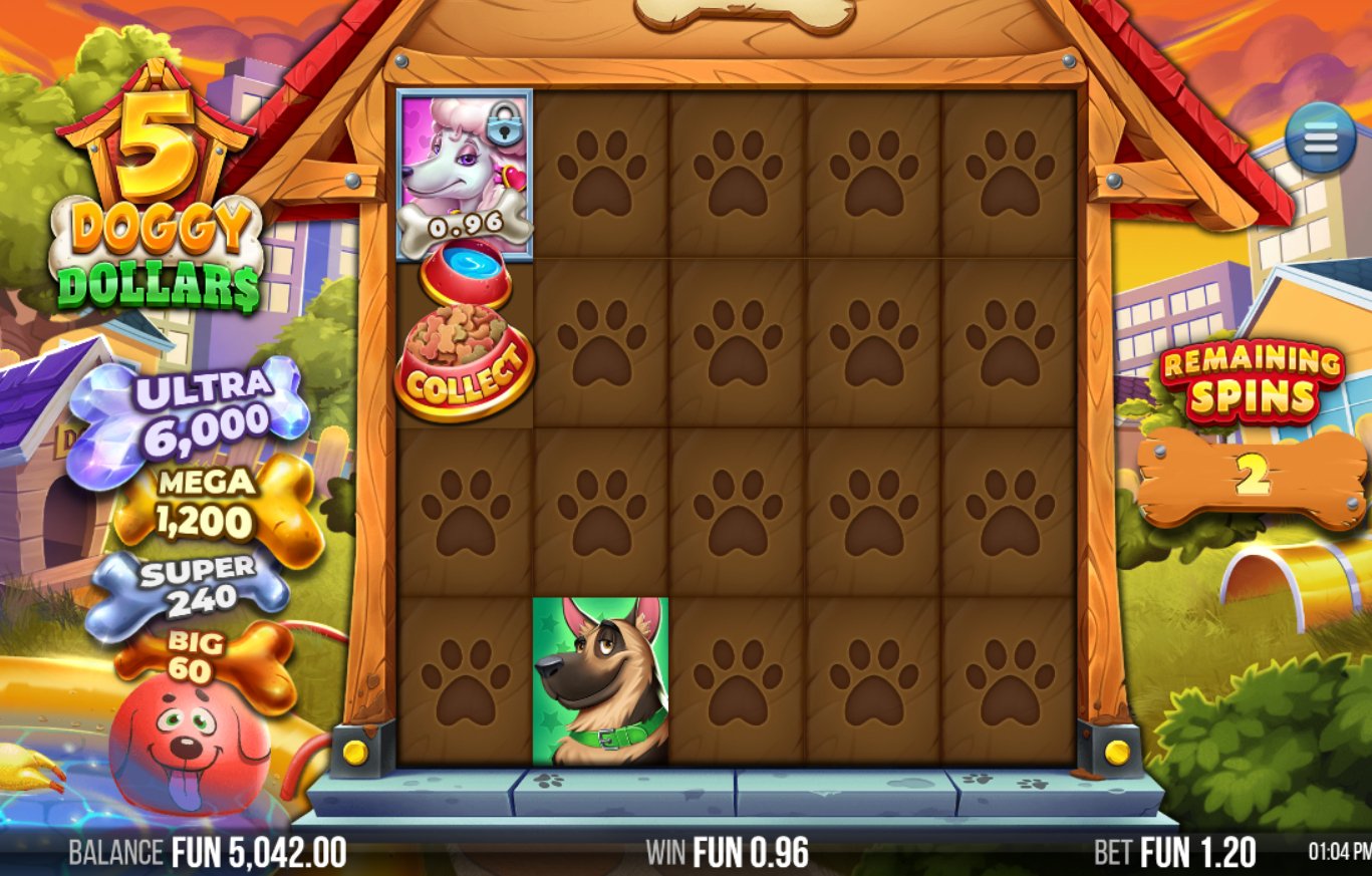 For at vinde 5 Doggy Dollars, skal du sørge for at få 3 eller flere matchende symboler på de tilgængelige indsatsfelter. Ved at samle Cash Bones og Big Prize Bones får du værdifulde øjeblikkelige gevinster. Hold øer med de flygtige Scatter-symboler, der er nøglen til at låse op for spillets bonusfunktion og afslører en verden af uudnyttet vinderpotentiale.