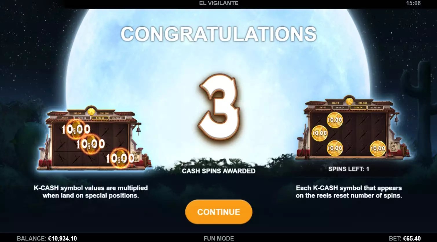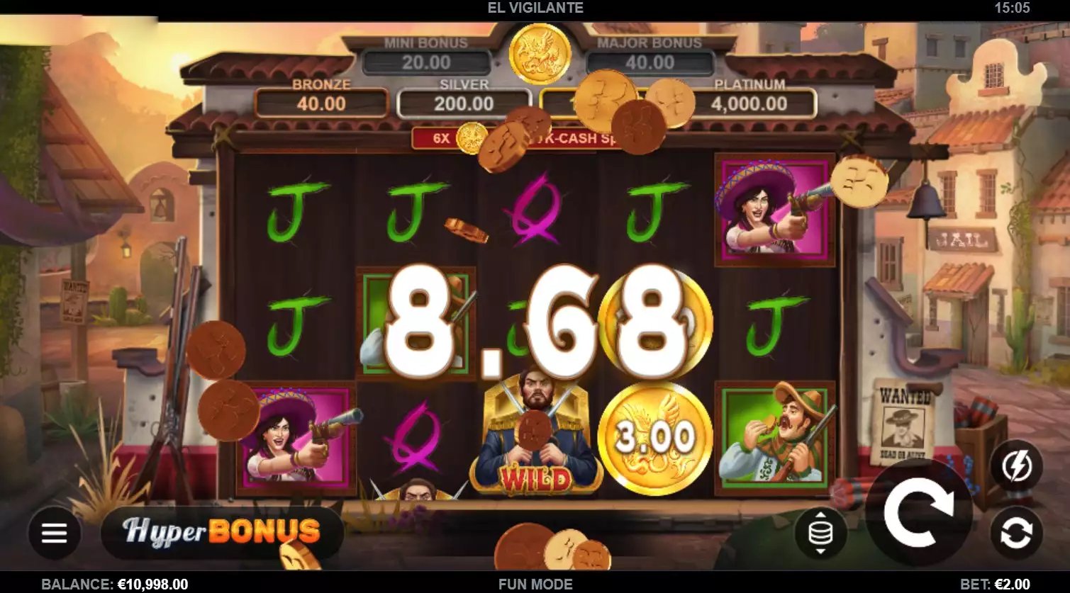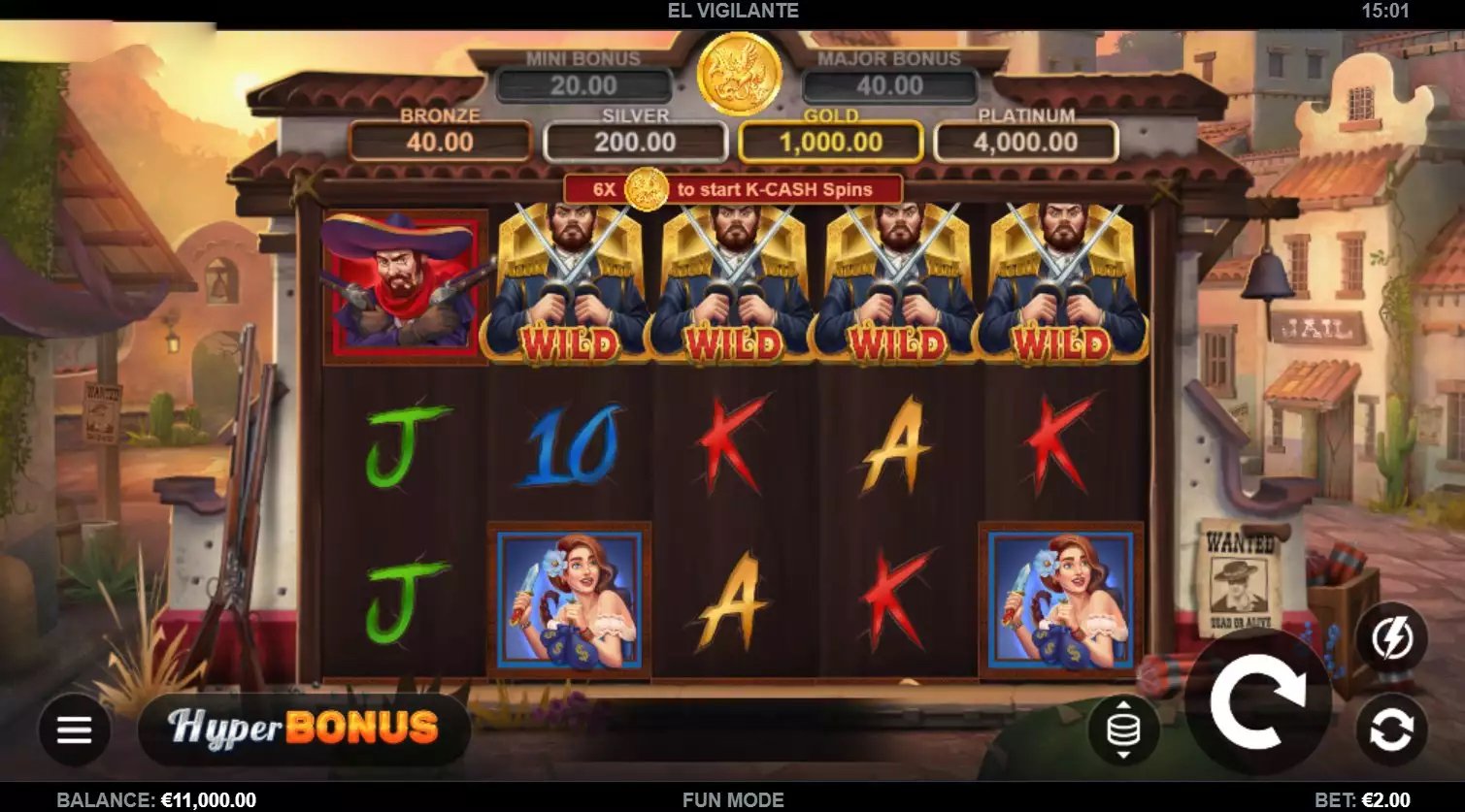 Endelig kommer vi til den bedste og steder spændende del – bonusser og gratis spins! Det er ingen hemmelighed, at vi alle elsker bonusser, da vi alle kan lide at blive belønnet for vores tålmodighed, strategier og tid brugt på et bestemt spil. Når du spilleren El Vigilante spilleautomaten, er der visse ting, du skal være opmærksom på, for at du kan nyder følgende bonusser og gratis spins. Først og fremsteder, som vi nævnte tidlspile i artiklen, hvis du samler 6 eller flere K-Cash-symboler, udløser du 3 K-Cash-spins, og hvis du rammer 3 eller flere bonussymboler, udløser du 8 gratis spins i grundspillet! Der er mange måder at vinde på – pengepræmier forbundet med K-Cash Spins-symboler, 4 niveauer af Cashpots eller to typer bonusser! Glem ikke, at pengepræmier og Cashpot-præmier kan ganges med klæbrige multipkaraktertorer, der er synlige på hjulene. Spænd sikrehedsselen, for vi fortæller dig, at denne spilleautomat selv tilbyder dig en hyperbonus! Kom direkte til sagen og spil gratis spins eller K-Cash Spins med det samme. Dette skulle efter sigende være en klassisk funktion fra softwareudvikleren Kalamba Games.